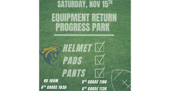 Cheer & Tackle Football will hold equipment return on Saturday, Nov 15th at Progress Park.